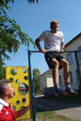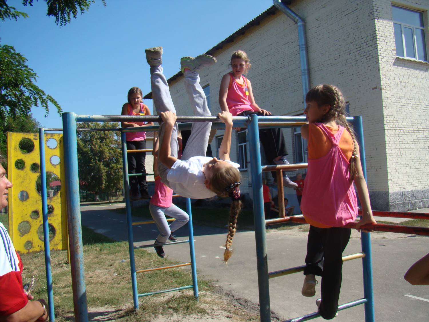 Із вису підйом переворотом в упор виконує рекордсменка школи серед дівчаток учениця 5-ого класу Веснянка Яна.