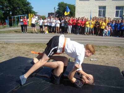 Свою майстерність демонструють юні самбісти учні 10 класу Мороз Дмитро та Палій Дмитро.
